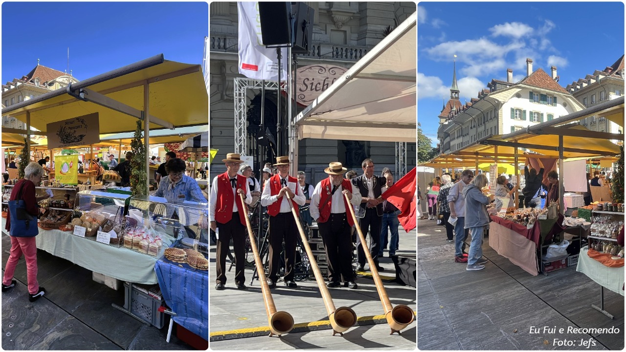 À frente do parlamento está a Praça Federal – Bundesplatz, que costuma ser palco de manifestações, mercados, feiras e eventos nacionais. No dia que estavamos na praça havia uma feira dos produtores rurais vendendo seus produtos e expondo suas tradições, como o belo Alphorn de Bronze.