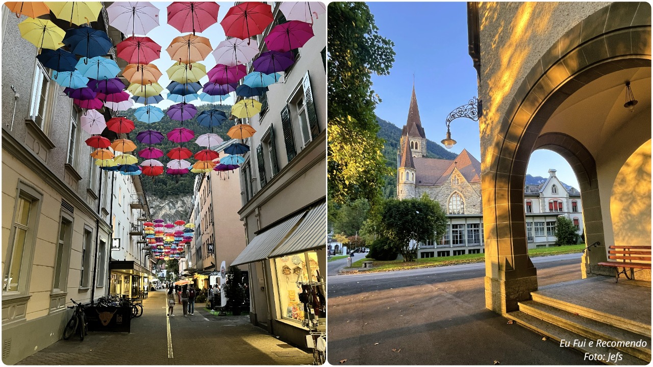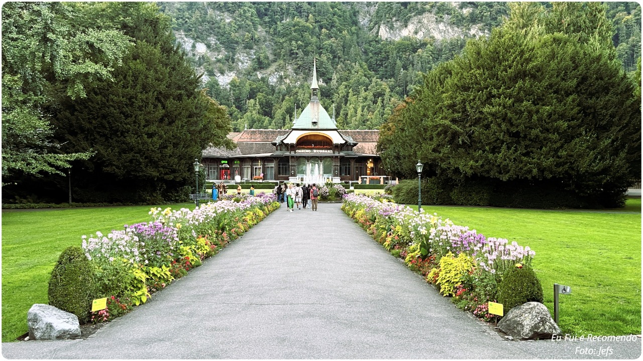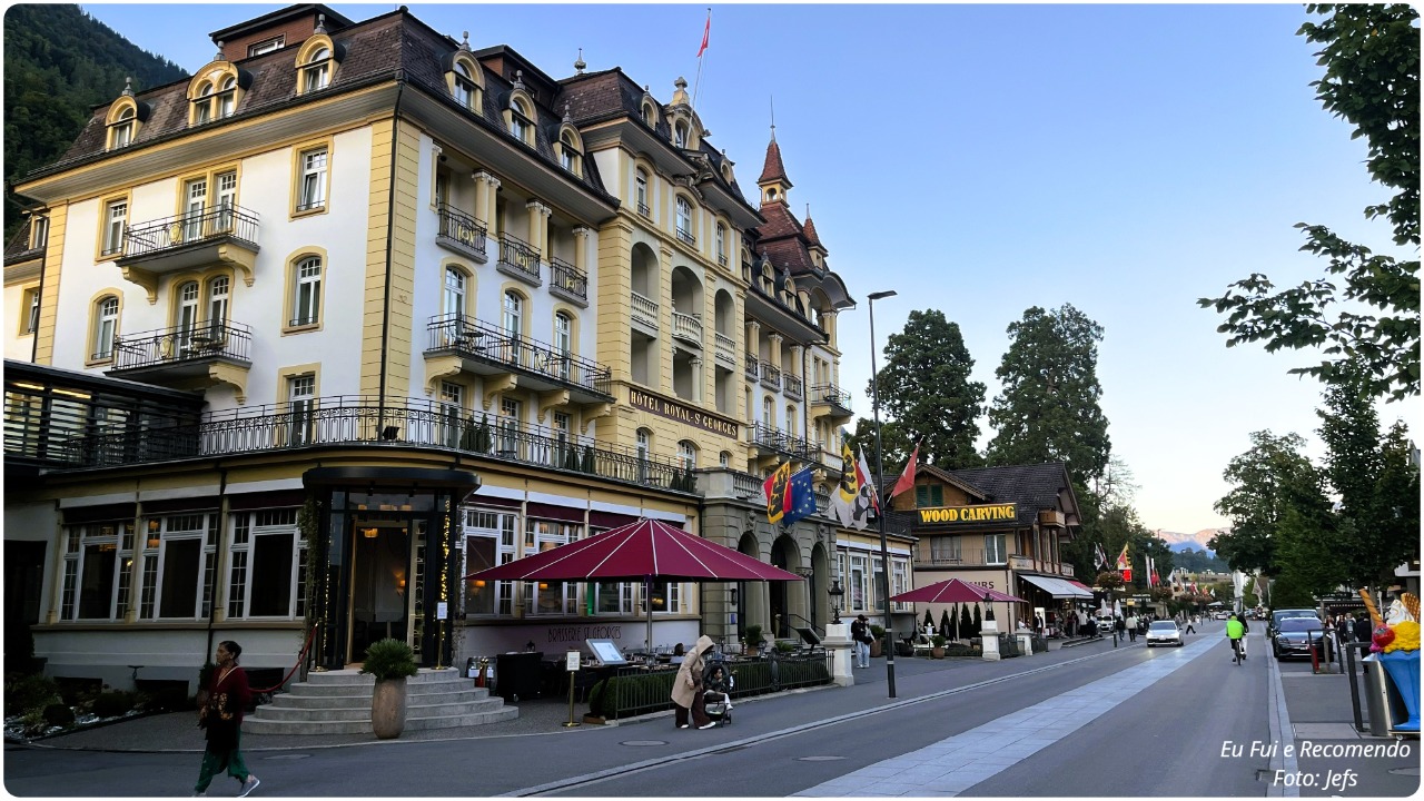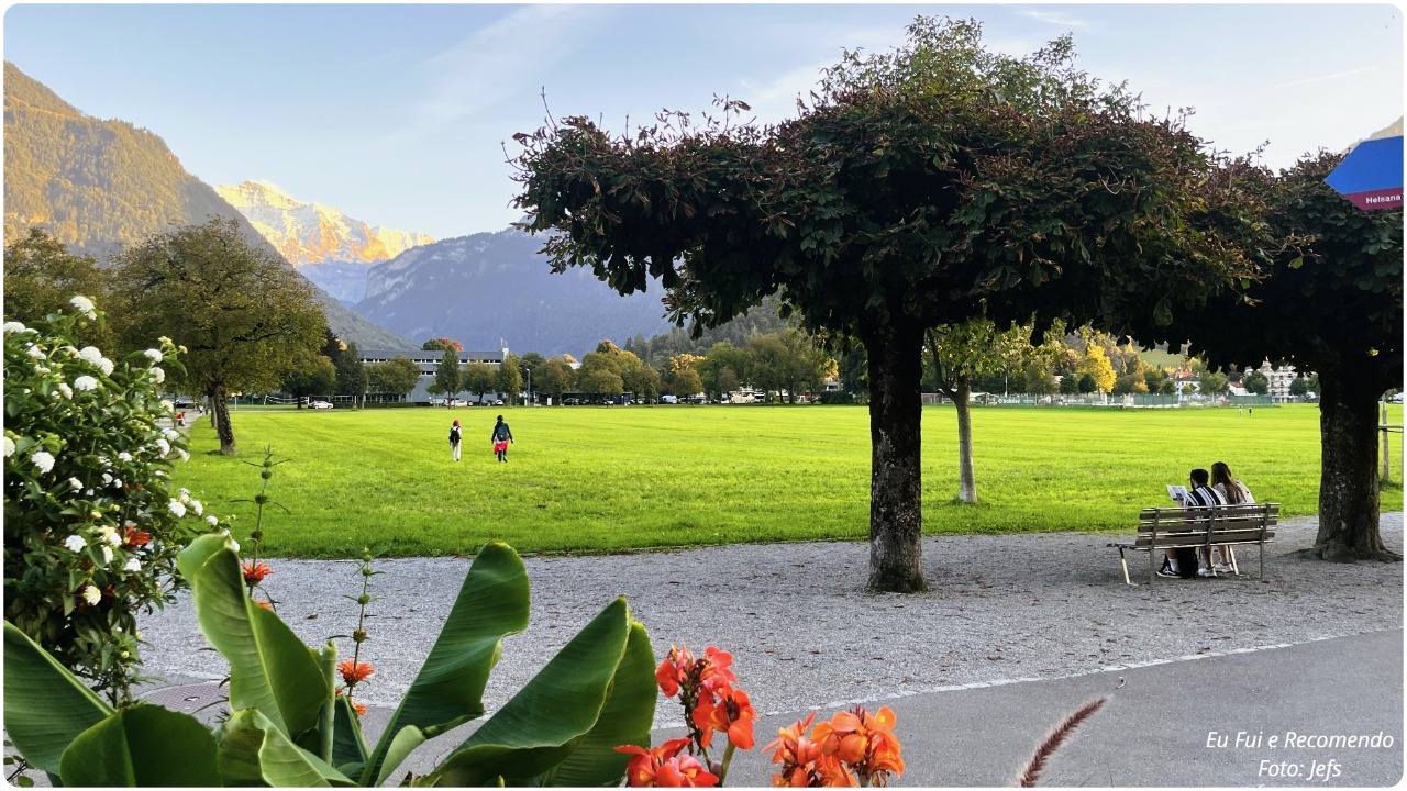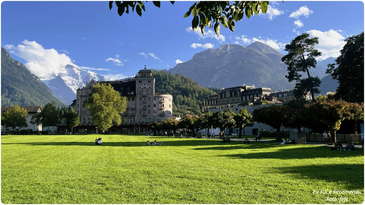 O centro de Interlaken é um verdadeiro encanto, com ruas amplas, limpas e cheias de charme, cercadas por belos hotéis e jardins floridos que dão um ar elegante à cidade. Em meio à paisagem, destaca-se uma grande área verde onde os parapentes pousam, criando um espetáculo colorido no céu.