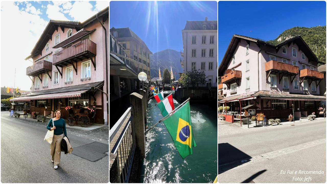 Durante nossa passagem por Interlaken, ficamos hospedados por duas noites no Hotel Rossli. A localização é excelente, ao lado de ruelas cortadas por canais decorados com bandeiras de vários país, inclusive a do Brasil. O hotel, também fica pertinho da Estação de Trem Interlaken West, o que facilitou bastante nossos deslocamentos.