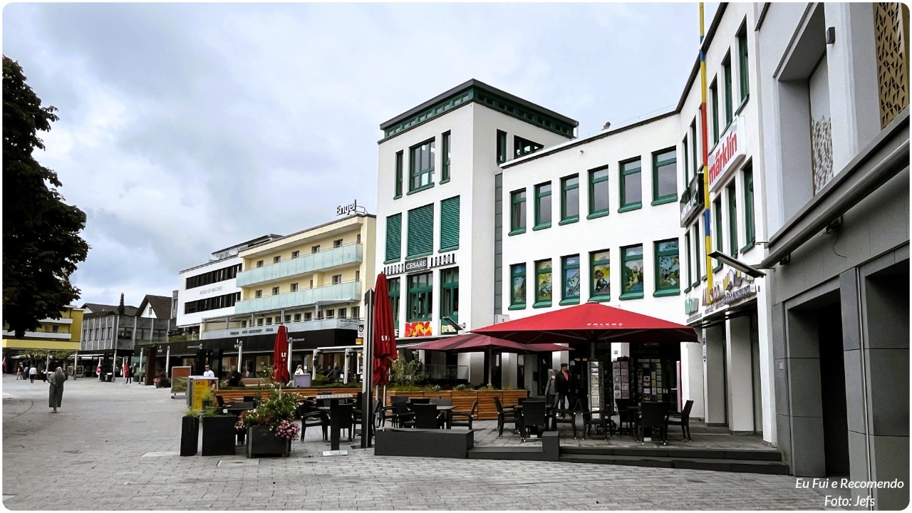 Caminhamos pela Rua Stadtle, a principal rua de pedestres, repleta de lojas, cafés, restaurantes, hotéis e esculturas modernas espalhadas pelo caminho.