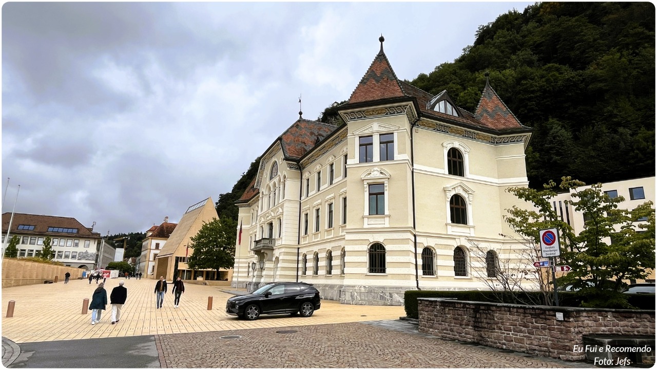 A construção de 1905 chama atenção pela elegância e pela harmonia entre o estilo moderno e os elementos tradicionais da arquitetura local. Mesmo sem acesso ao interior, a visita permitiu admirar o conjunto arquitetônico e a bela integração das construções com o cenário montanhoso que emoldura Vaduz.