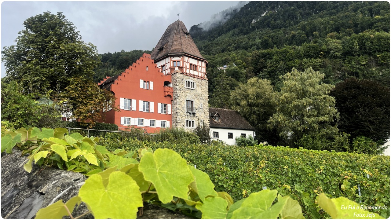 No final de uma tarde do outono de 2025, visitamos externamente a Vinícola Hofkellerei, em Vaduz. O local é cercado por colinas suaves e vinhedos perfeitamente alinhados que convidam aos visitantes caminhar entre as suas fileiras dos parreirais.