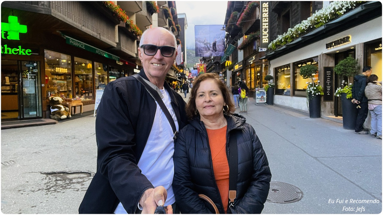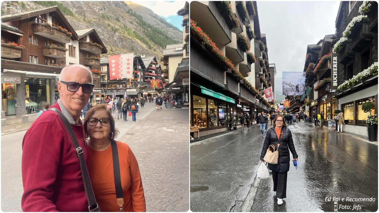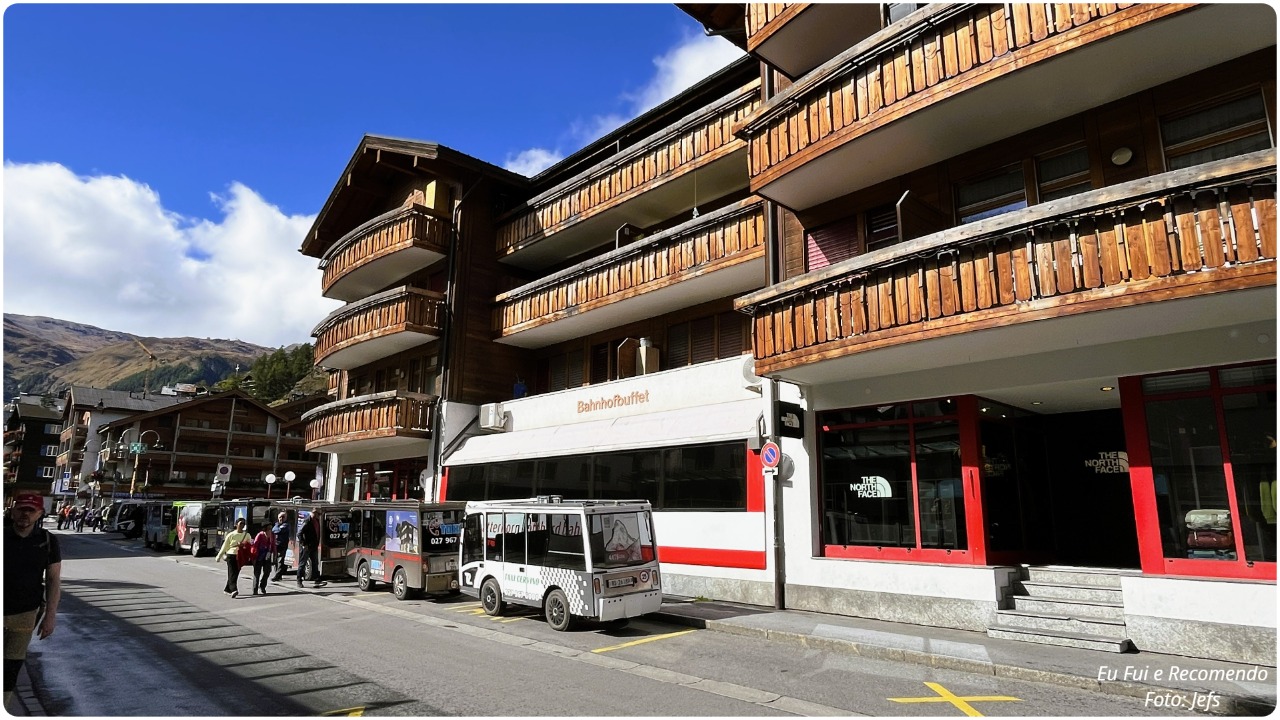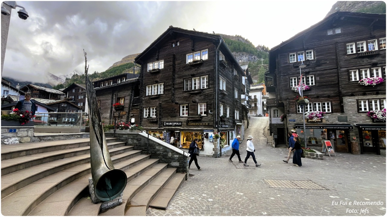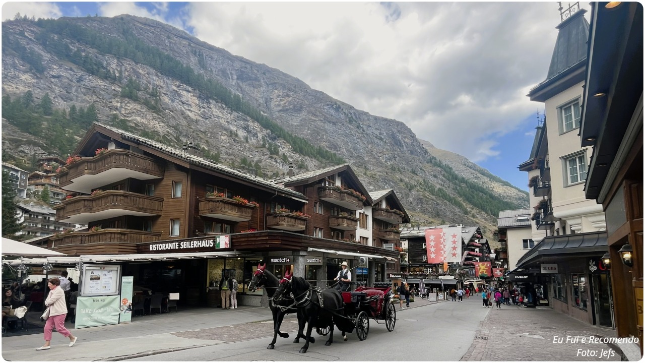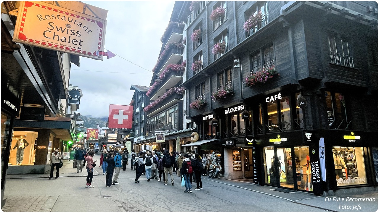 Durante nossa estada em Zermatt, tivemos a oportunidade de explorar com calma o centro da cidade, um lugar encantador, repleto de chalés típicos, lojas charmosas e restaurantes acolhedores, tudo com a vista majestosa para as montanhas alpinas.