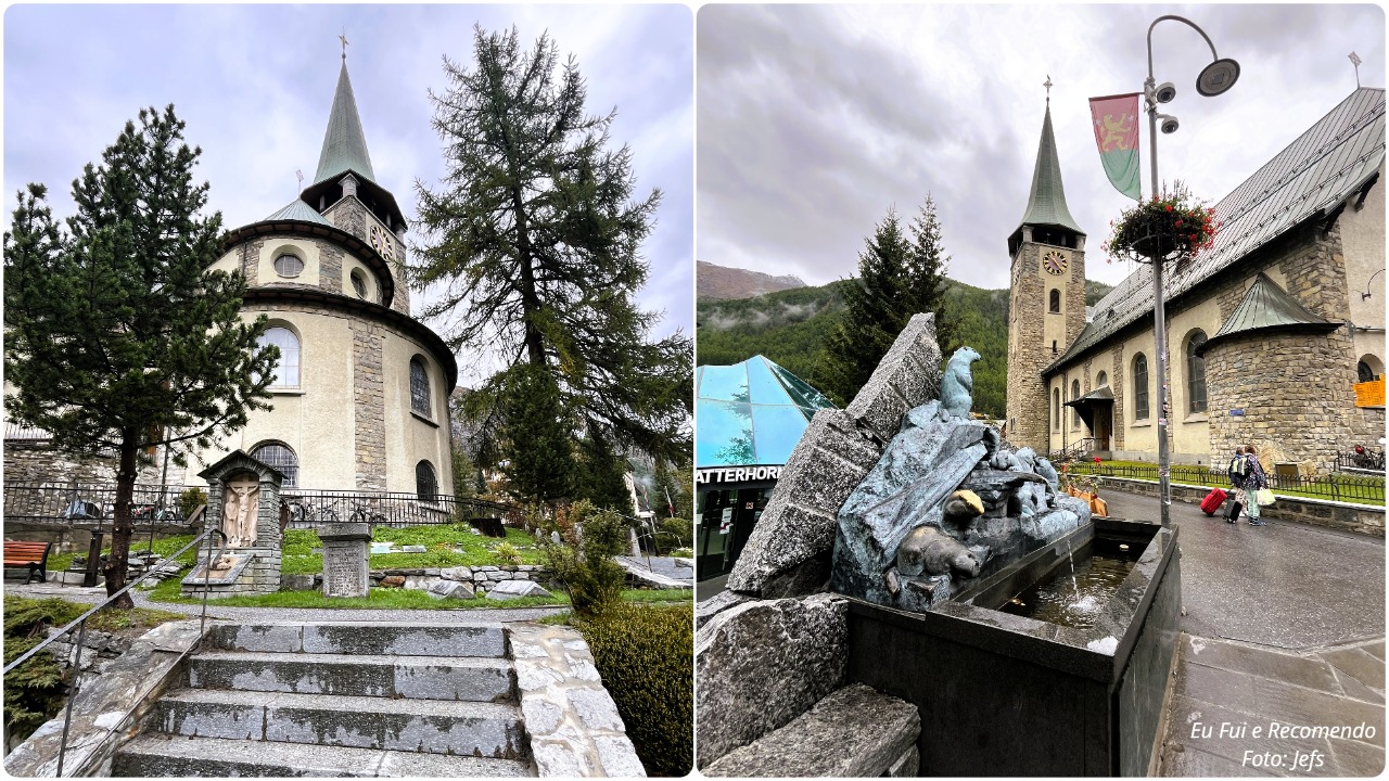 Por dentro, a igreja é simples e charmosa, com vitrais coloridos, esculturas, altares que contam e unem fé e história de maneira única. Outro atrativo de Zermatt é o Alphorn de Bronze.