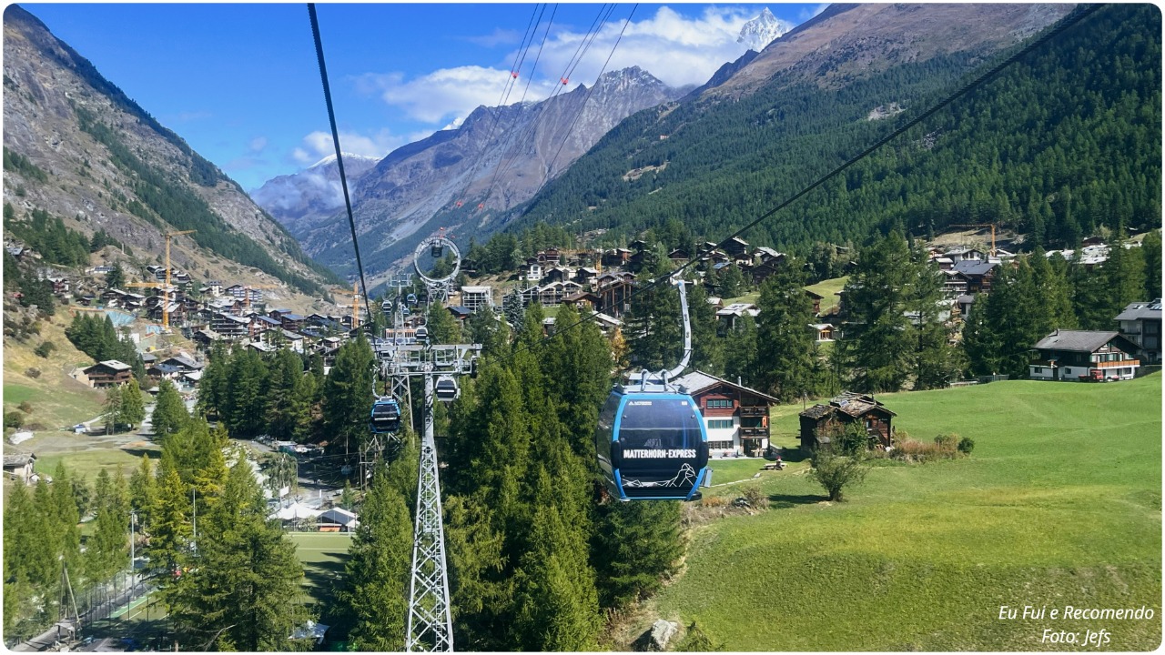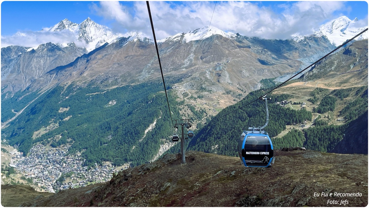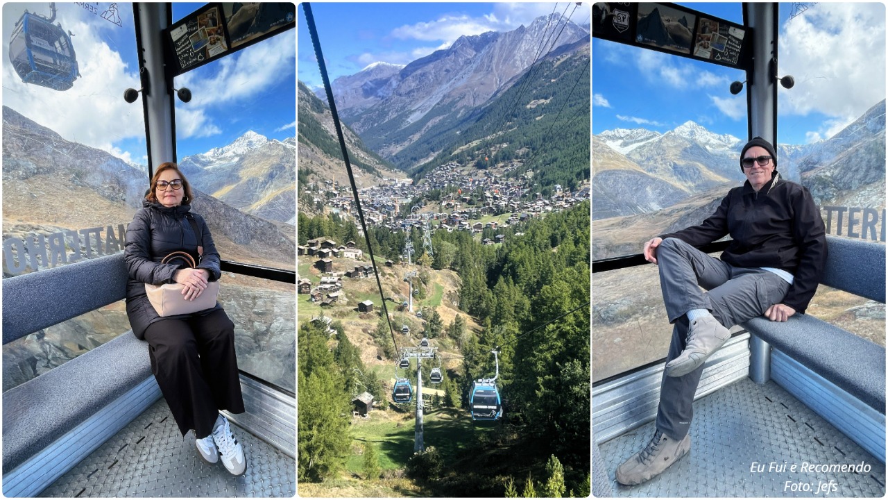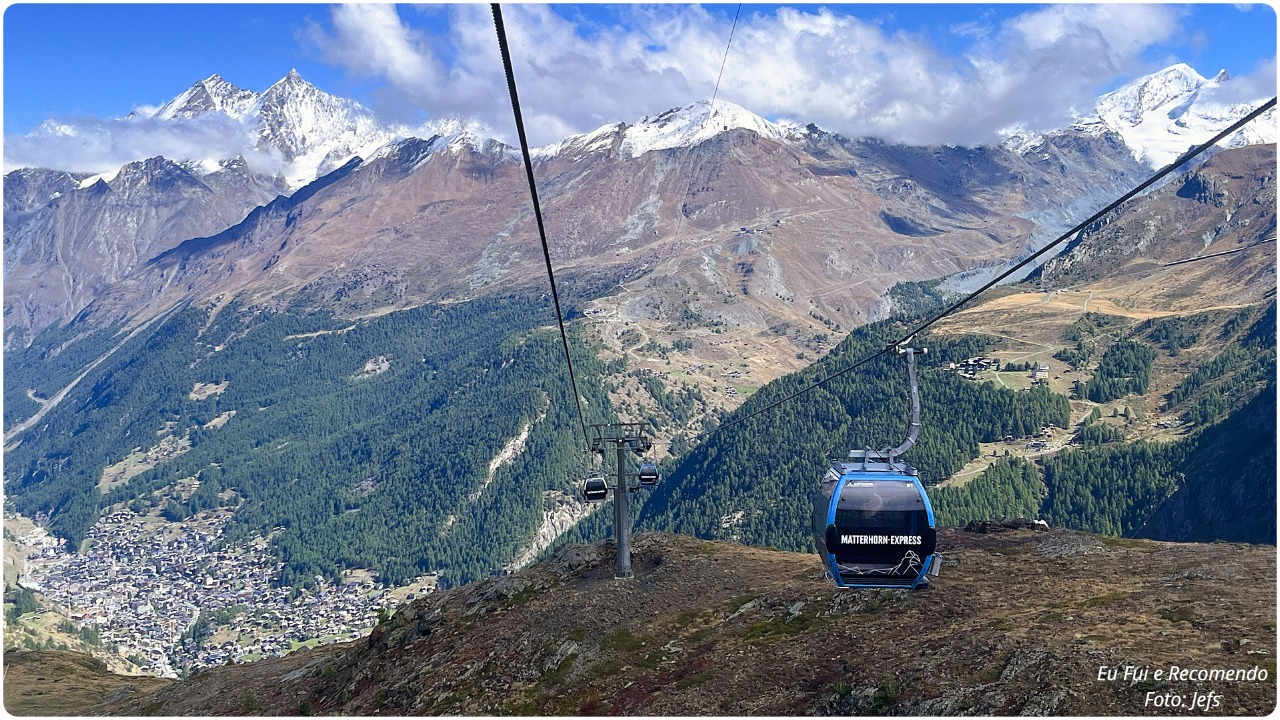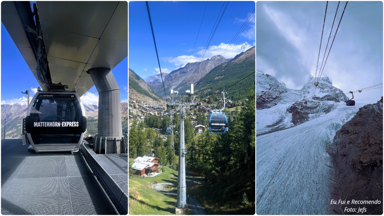Em nosso último dia em Zermatt, no início do outono de 2025, fomos presenteados com um céu azul e um clima perfeito para encerrar nossa estada com chave de ouro. Decidimos fazer o passeio completo de teleférico conhecido como Matterhorn Express, uma experiência que superou todas as expectativas.