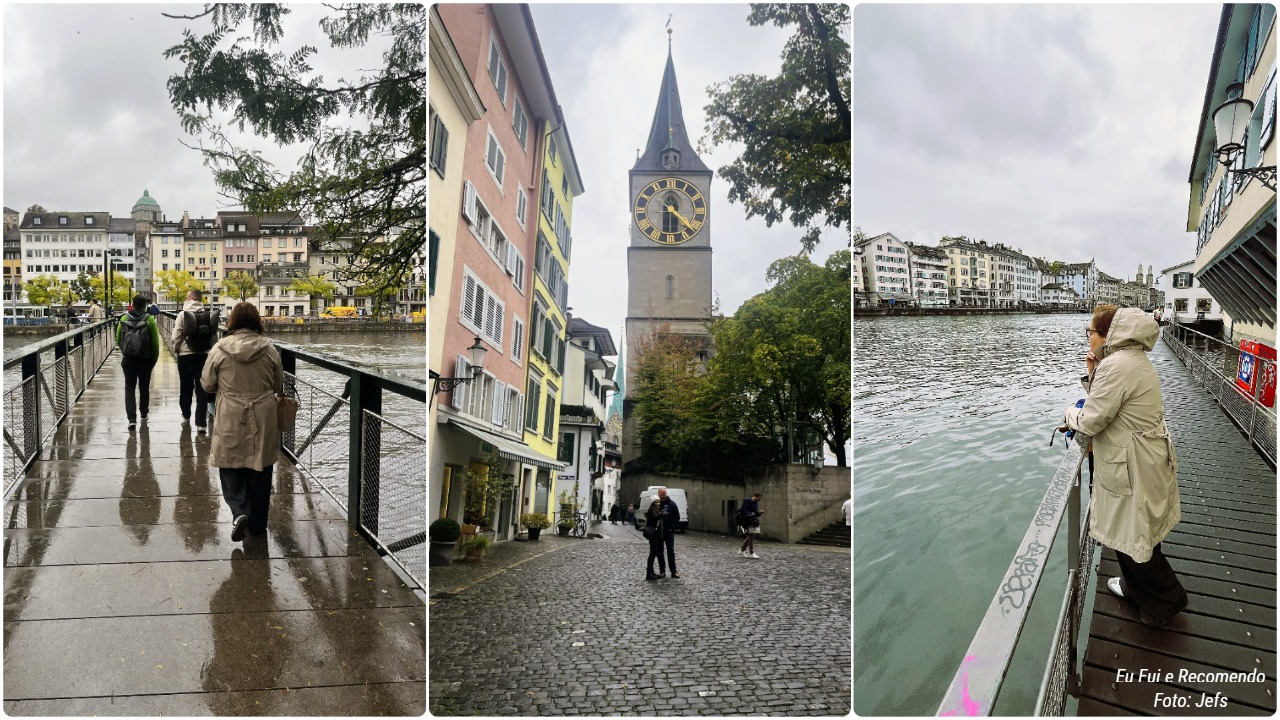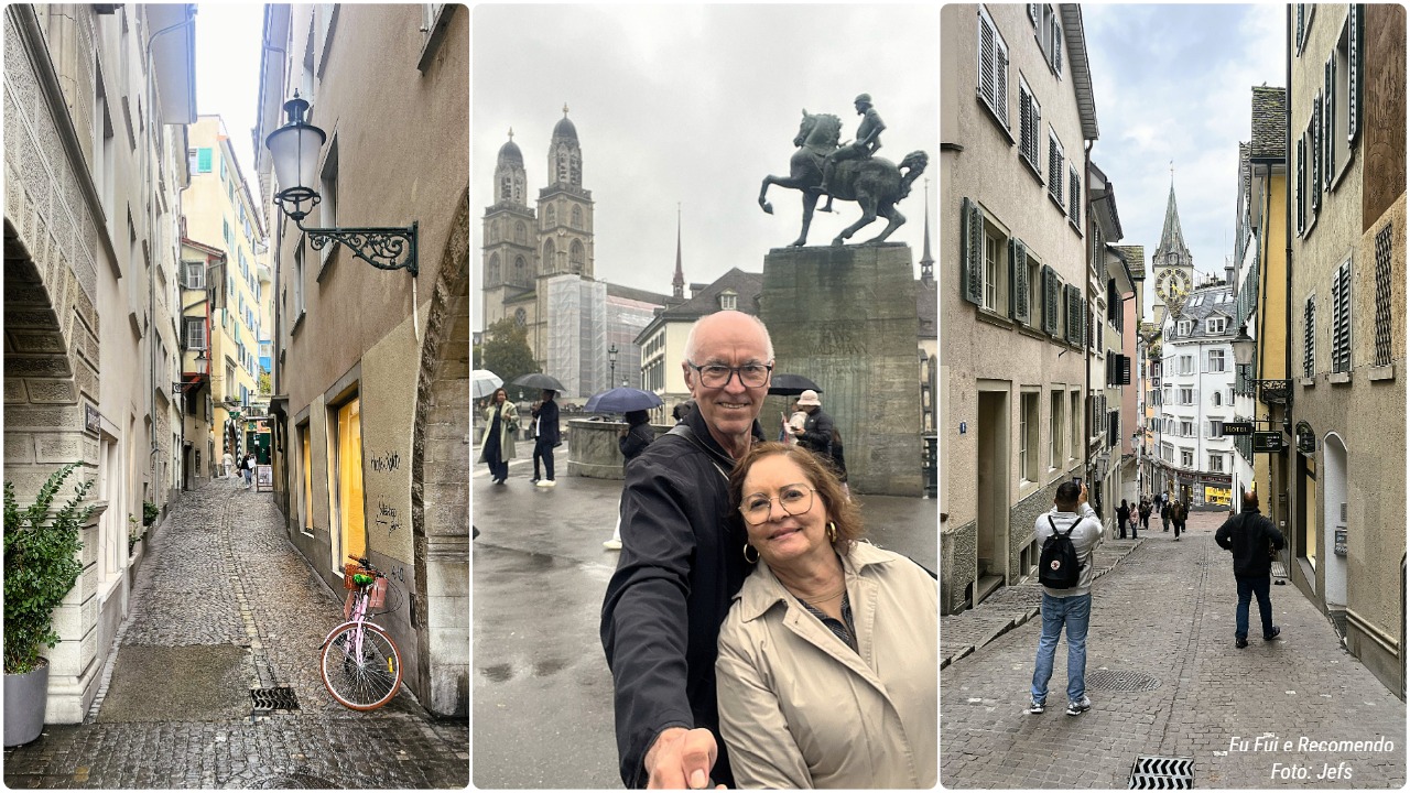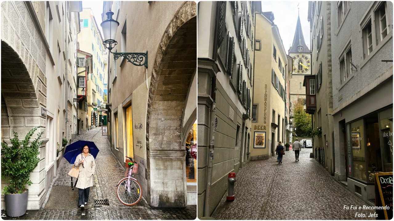 Nosso passeio pelo Centro Histórico de Zurique foi uma verdadeira viagem no tempo! O dia estava garoando, mesmo assim, caminhamos por aquelas ruas estreitas e medievais, cheias de charme e história em cada esquina.
