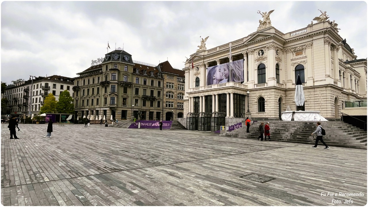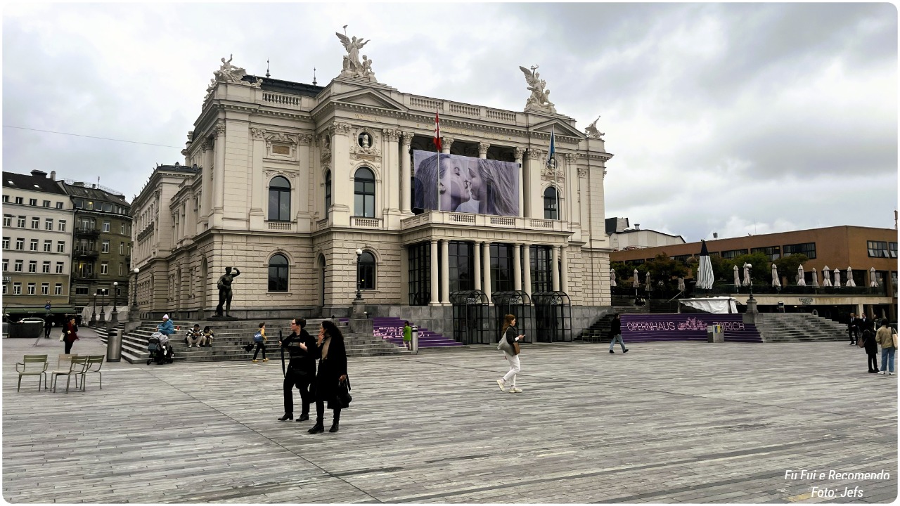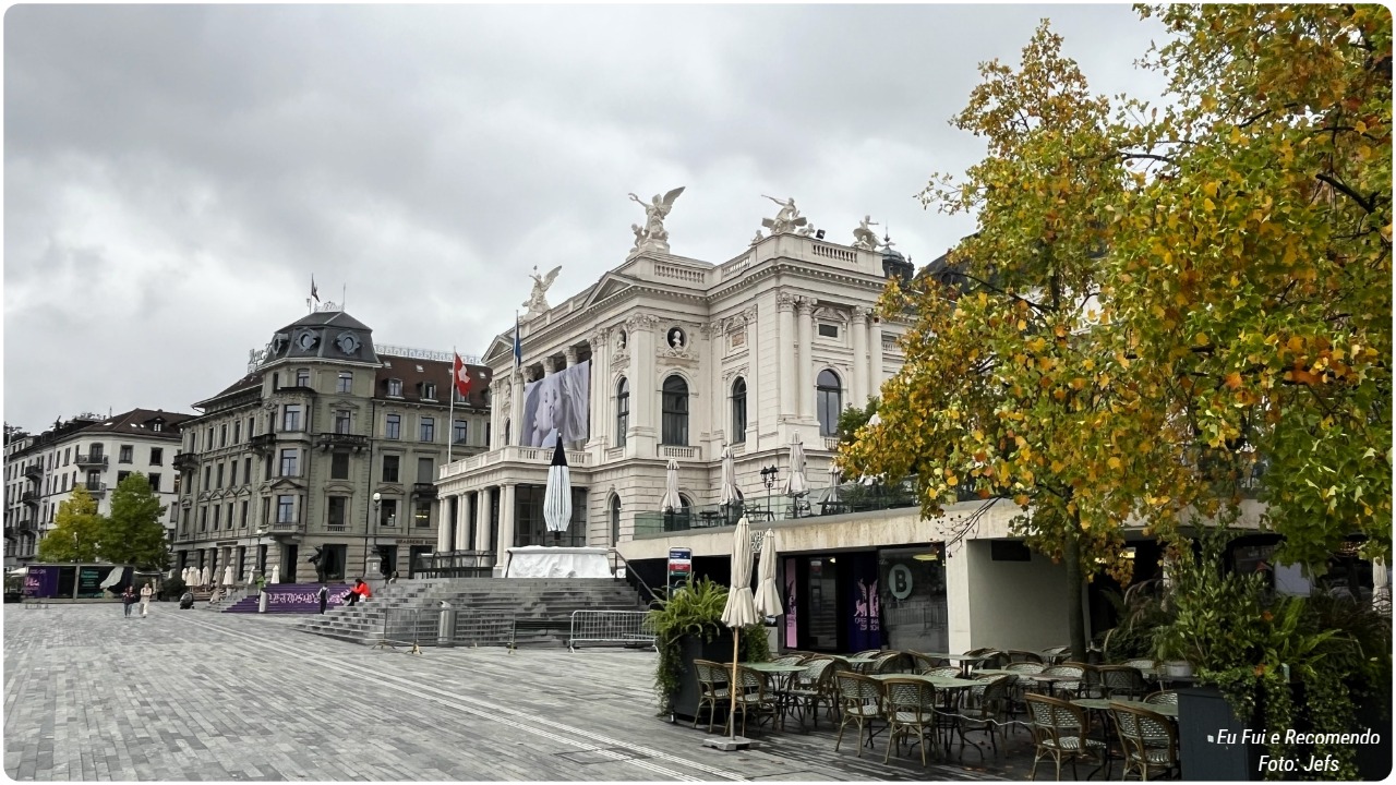 No coração da praça, destaca-se a Opernhaus Zurich, a famosa casa de ópera da cidade. O prédio é imponente, com uma fachada clássica e detalhes arquitetônicos sofisticados, que mostram a tradição cultural de Zurique.