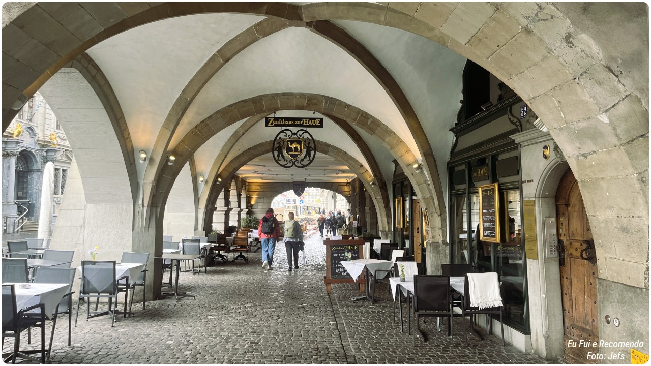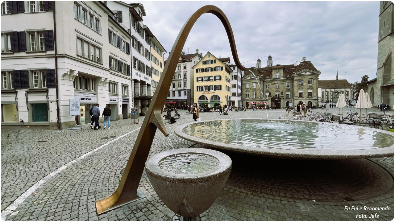 Passamos pela Praça Munsterhof, datada da Idade Média, que foi, durante séculos, o principal ponto de encontro e feira da cidade. A praça é cercada por prédios históricos, muitos deles com fachadas coloridas e janelas típicas suíças, que hoje abrigam cafés, lojas e bancos. Há também uma fonte circular com uma escultura moderna, um arco de metal que simboliza o fluxo contínuo da água e da vida urbana.