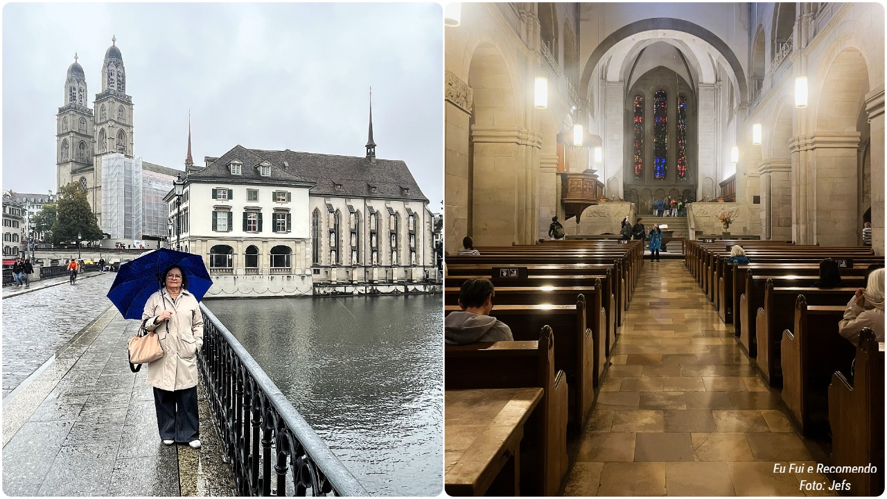 A imponente Igreja Grossmünster, um dos símbolos mais conhecidos de Zurique. Com suas torres gêmeas visíveis de vários pontos da cidade, impressiona pela arquitetura românica e pela importância histórica, já que foi um dos centros da Reforma Protestante liderada por Ulrico Zuínglio.